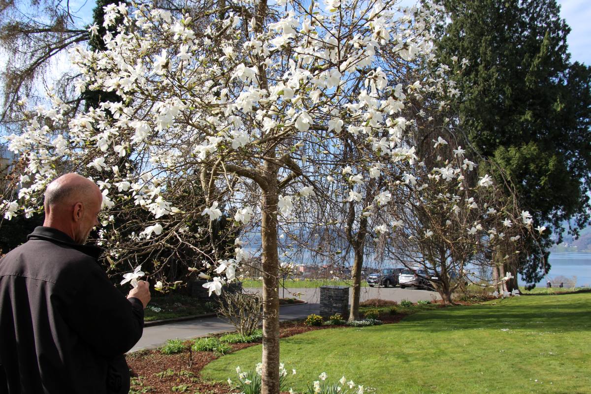 Da man derzeit noch immer mit nächtlichem Frost rechnen muss, ist das Becken beim Rundgang noch leer. Das Wichtigste momentan seien die verschiedenen Vorbereitungen. «Verpasst man den richtigen Zeitpunkt zum Zurückschneiden, Jäten, Düngen oder Anpflanzen, hinkt man das ganze Jahr über hinterher», sagt Blum dazu. Ende März sei es im Garten noch einige Wochen zu früh für eine üppige Blütenpracht. Magnolien und Kirschbäume blühen zwar bereits, die Laubbäume sind aber noch kahl. Im Naturweiher fehlen zudem noch die Seerosen und bei einigen Streifen zwischen Rasen und Gehweg sieht man nur braunes Erdreich. «Hier wird später noch eine Blumenwiese angesät», erklärt er. «Die Arbeit geht uns nie aus», fügt Blum an.
